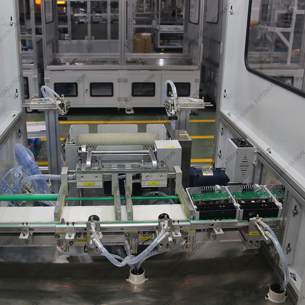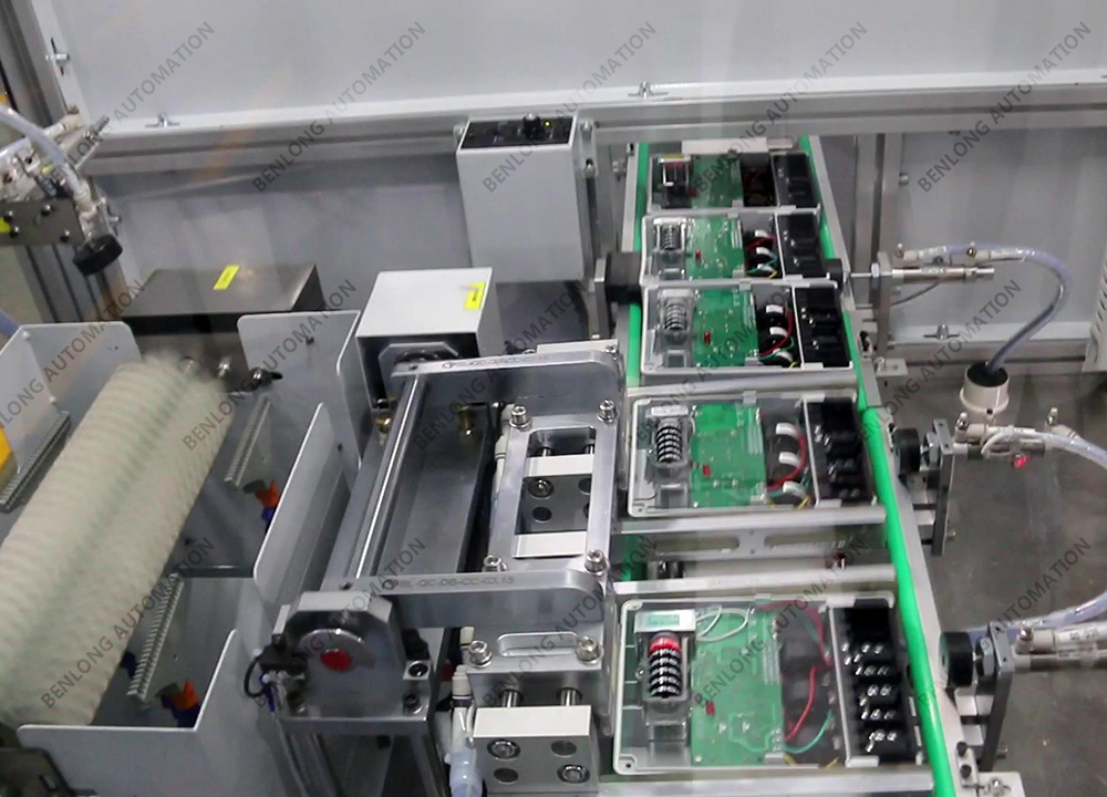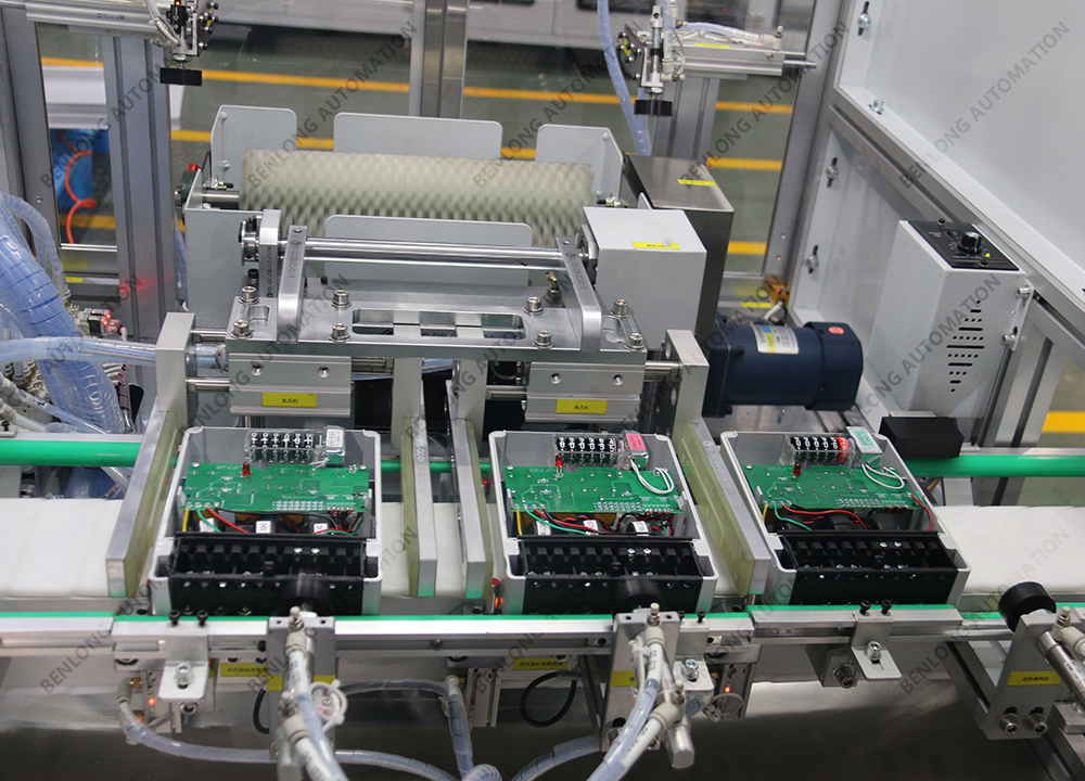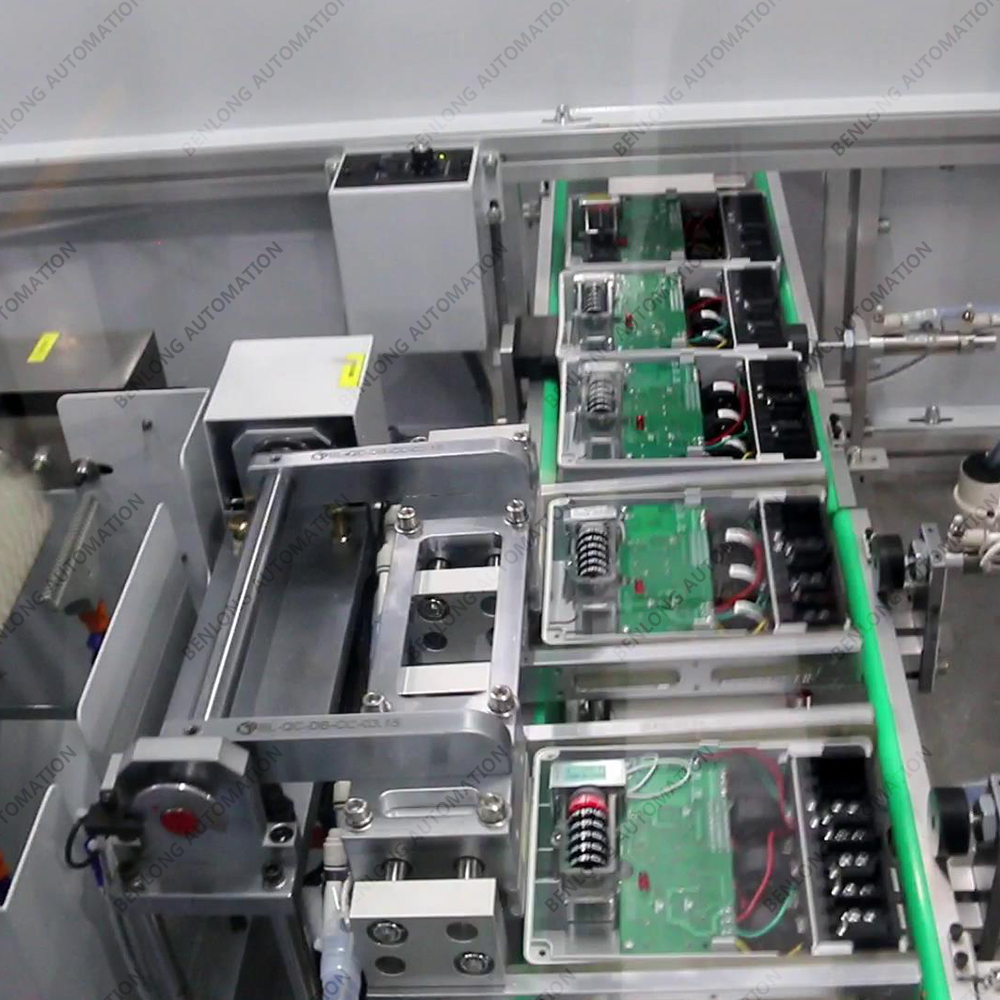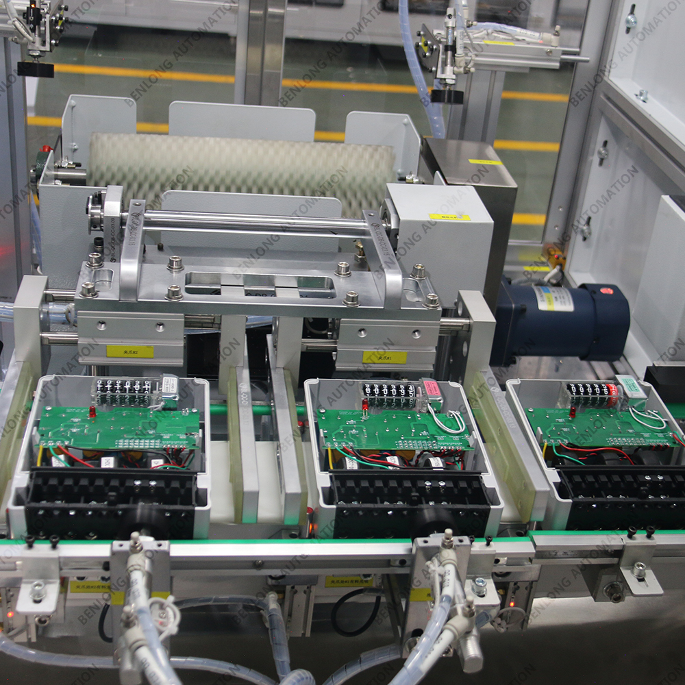 具有產品自動上料底座、裝配導電柱、裝配線路板、錫焊、鎖螺絲、裝配密封圈、裝配玻璃罩、裝配外圈、鎖螺絲、特性檢測、