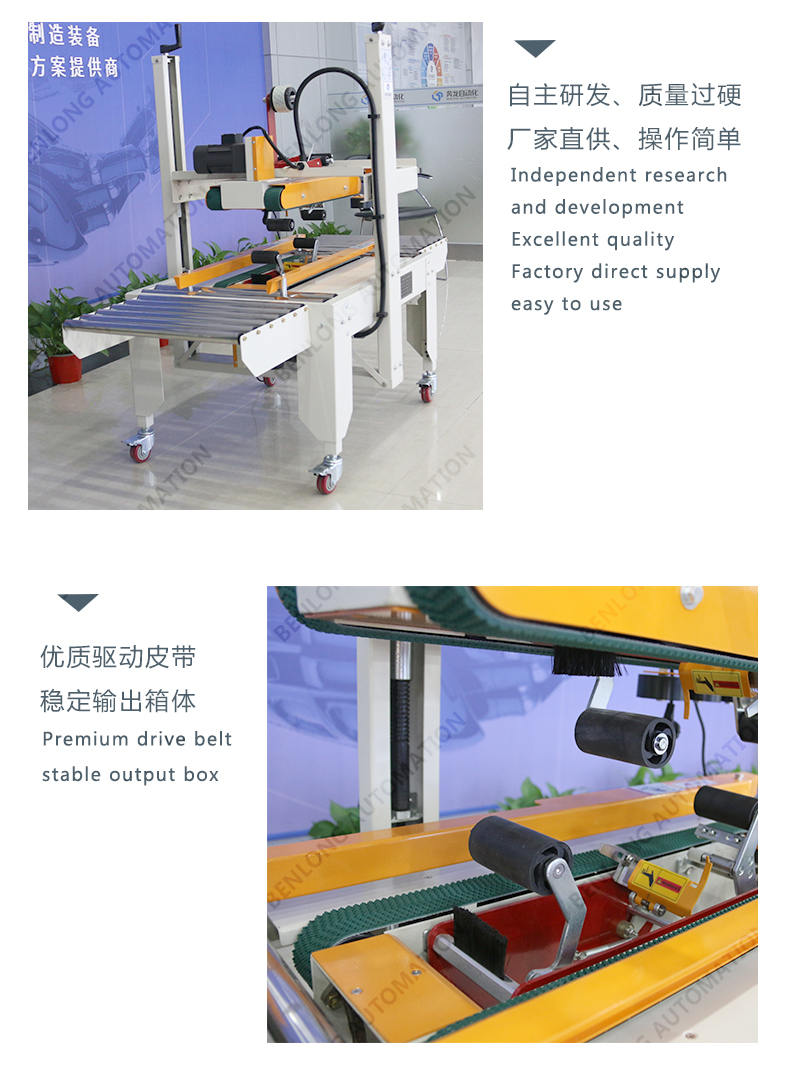 人工放料或其他包裝設(shè)備出料口自動(dòng)放料,自動(dòng)封箱。