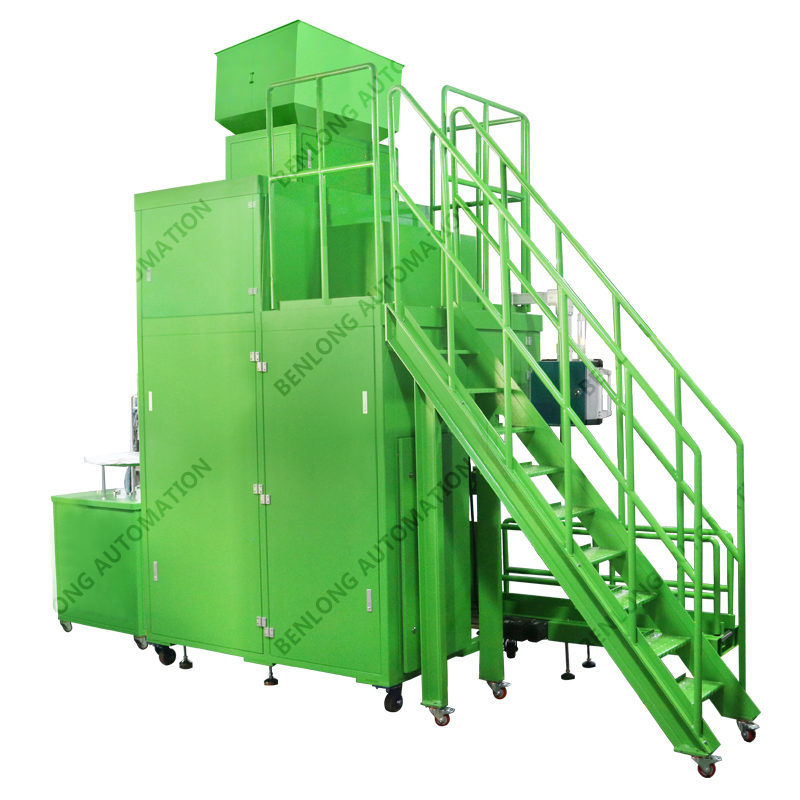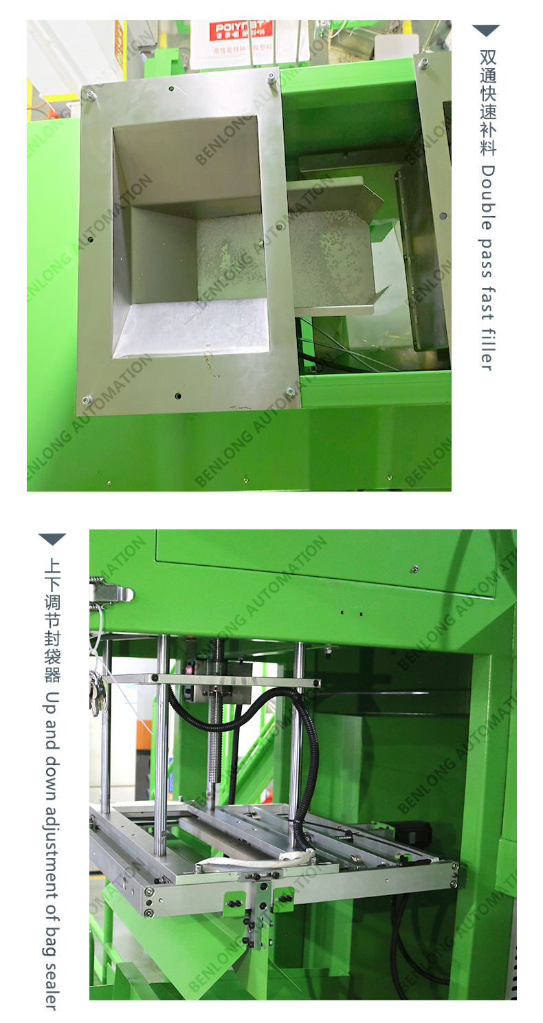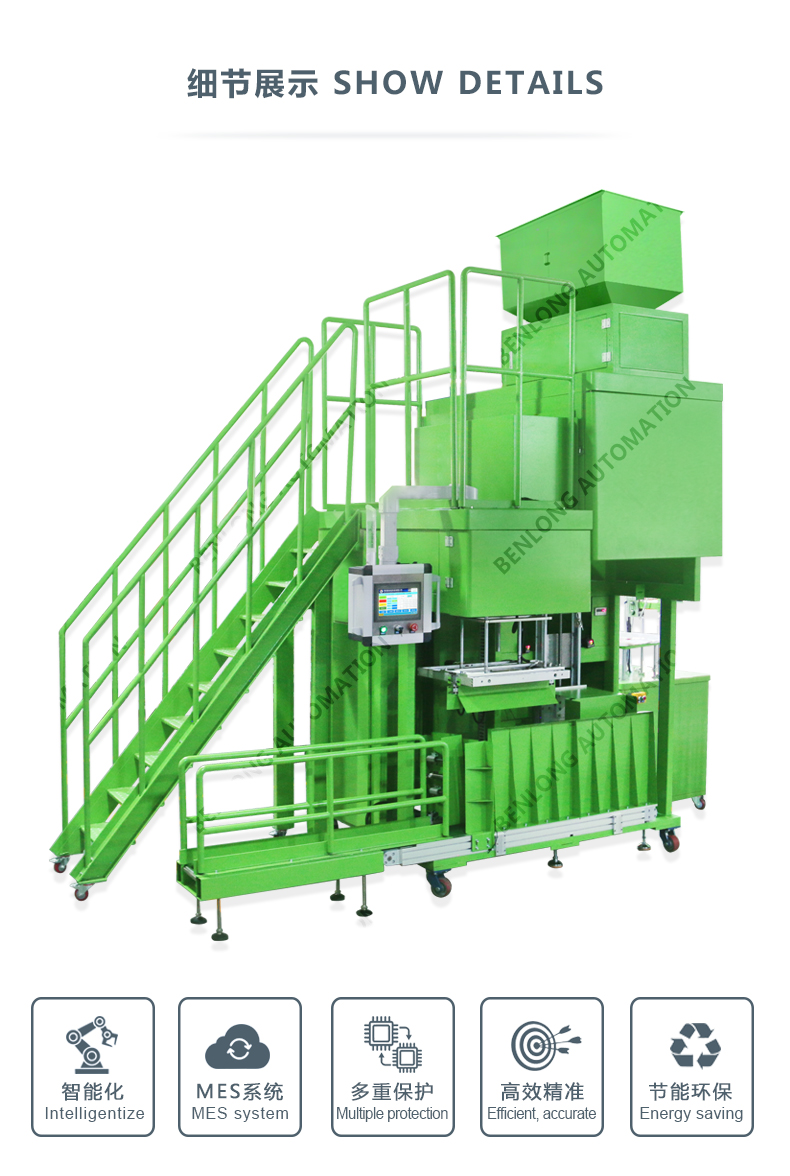人工套袋/自動套袋,自動稱重,自動投料,自動檢重,自動真空,自動封口;自動出包。