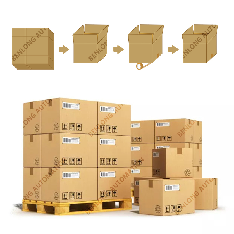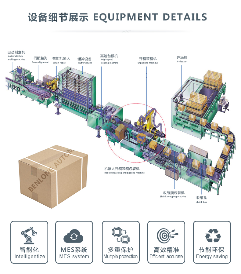具有自動物流、分選、折內(nèi)盒、裝內(nèi)盒、內(nèi)盒貼標(biāo)、稱重、內(nèi)盒盒蓋、外箱開箱、裝外箱、外箱盒蓋、外箱貼標(biāo)、封箱、捆扎、