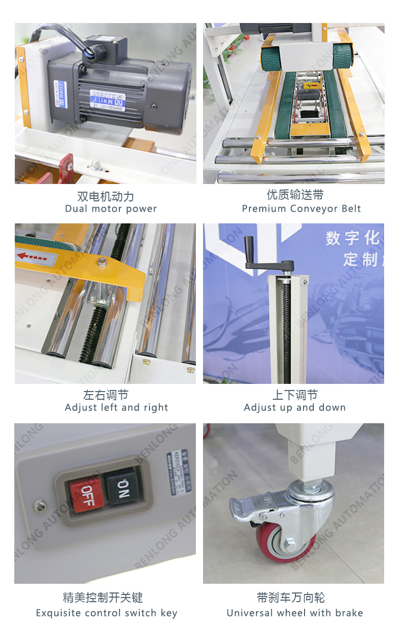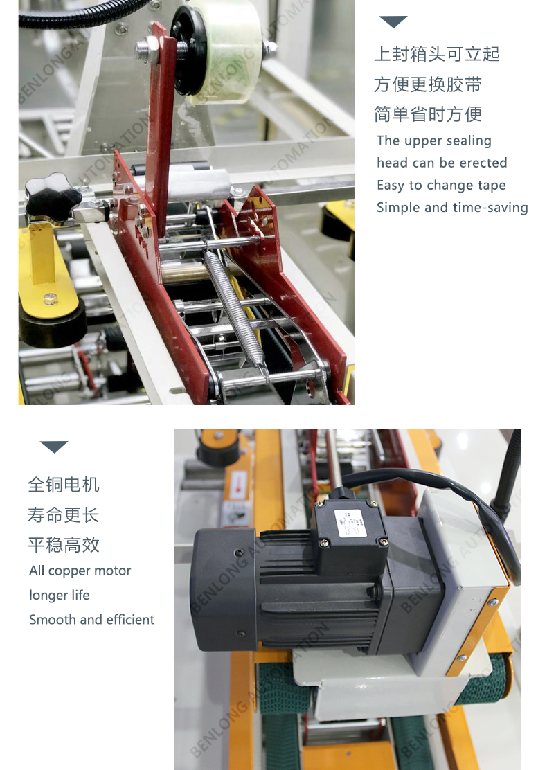 人工放料或其他包裝設(shè)備出料口自動(dòng)放料,自動(dòng)封箱。