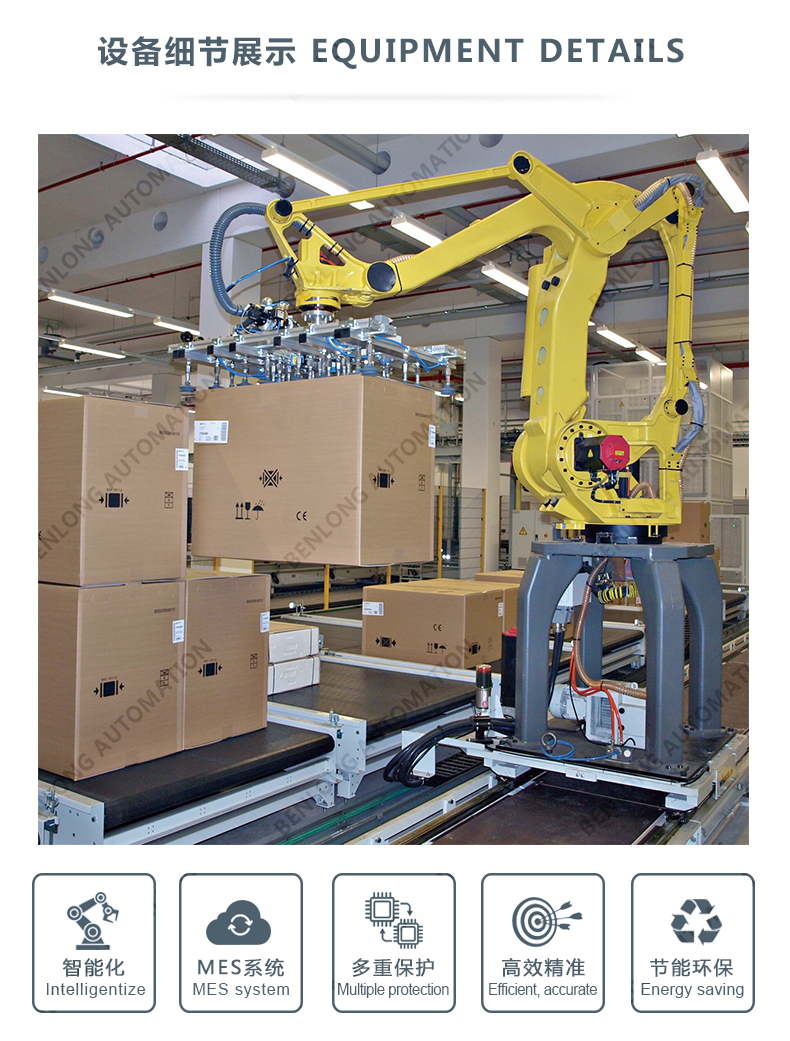 具有自動(dòng)隔料分組、產(chǎn)品裝袋、熱封塑、小盒成型、產(chǎn)品裝入小盒內(nèi)、小盒貼標(biāo)簽、中盒成型、小盒產(chǎn)品裝入中盒內(nèi)、中盒貼標(biāo)簽、外箱自動(dòng)成型、中盒產(chǎn)品裝入外箱內(nèi)、外箱自動(dòng)貼標(biāo)簽、檢測(cè)、噴碼、封透明膠帶、捆扎帶、90°旋轉(zhuǎn)、下料碼垛、缺料報(bào)警等工序的在線監(jiān)測(cè)、實(shí)時(shí)監(jiān)控、質(zhì)量溯源、條碼識(shí)別、關(guān)鍵元器件壽命監(jiān)測(cè)、數(shù)據(jù)存儲(chǔ)、MES系統(tǒng)與ERP系統(tǒng)聯(lián)網(wǎng)、參數(shù)任意配方、智慧能源分析與節(jié)能管理系統(tǒng)、智能裝備服務(wù)大數(shù)據(jù)云平臺(tái)等功能。