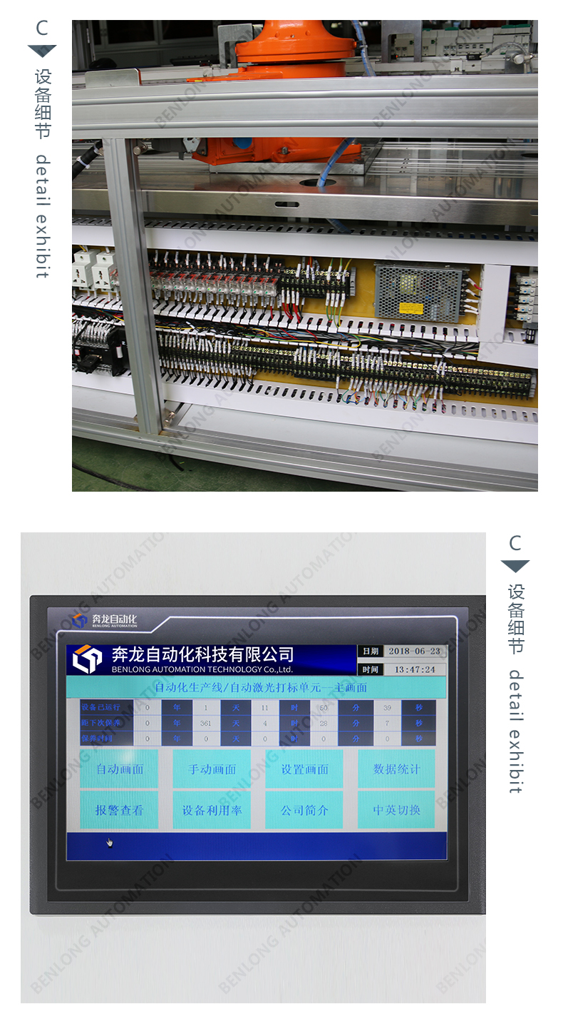 具有自動(dòng)激光打標(biāo)產(chǎn)品商標(biāo)、產(chǎn)品參數(shù)、CCD視覺(jué)檢測(cè)、不良品區(qū)分、缺料報(bào)警、自動(dòng)旋轉(zhuǎn)等工序的在線監(jiān)測(cè)、實(shí)時(shí)監(jiān)控、質(zhì)量溯源、條碼識(shí)別、