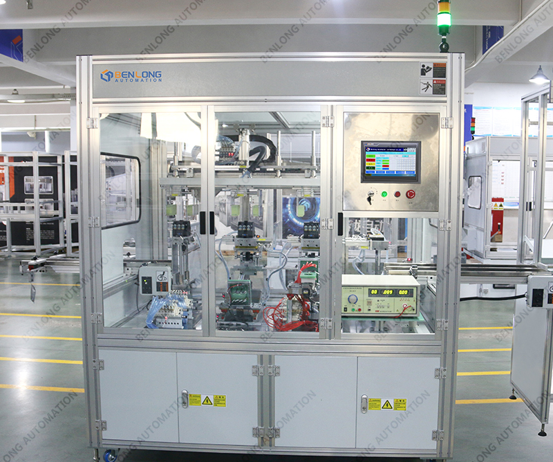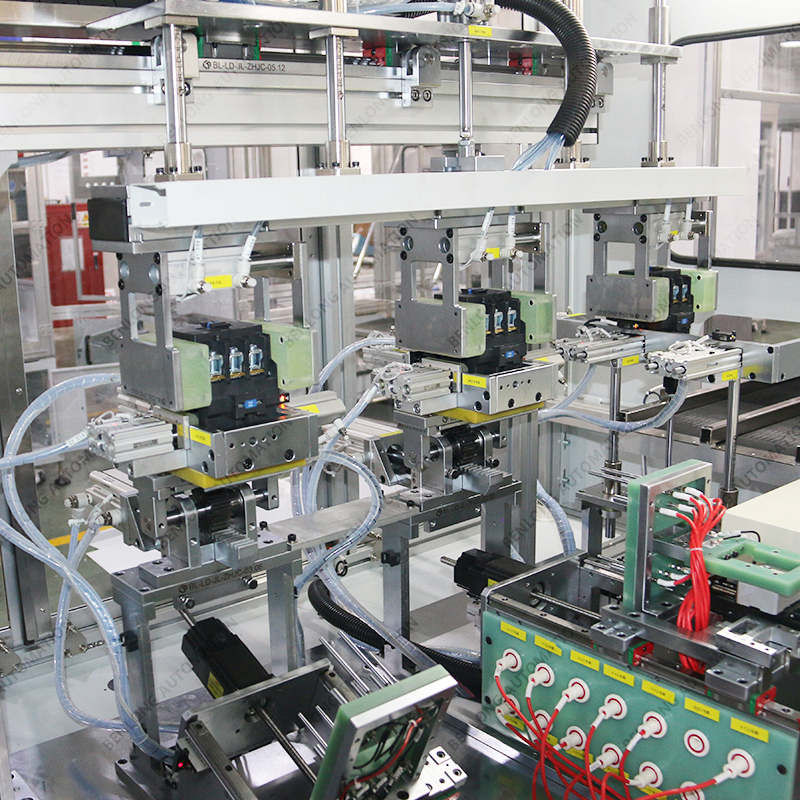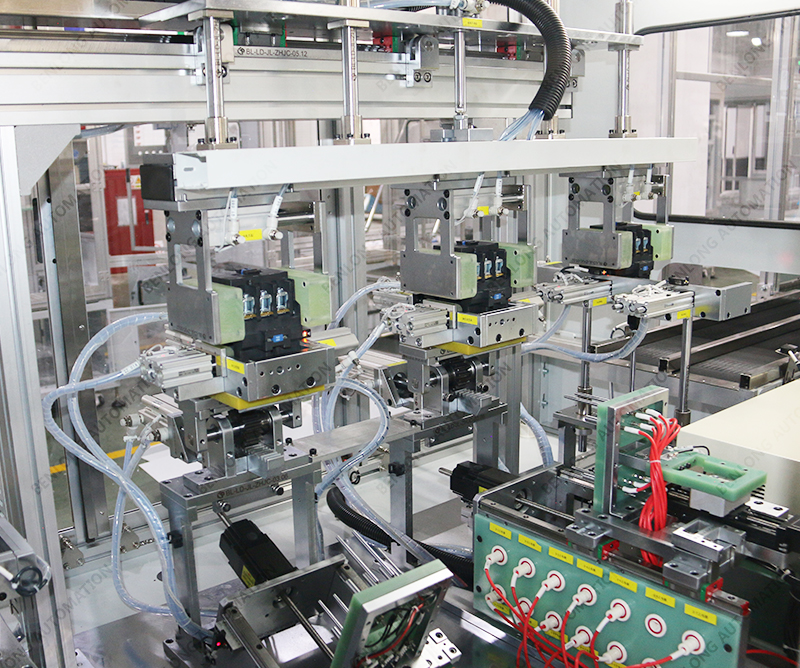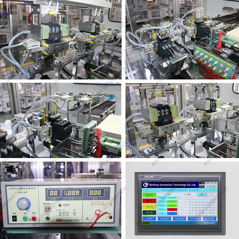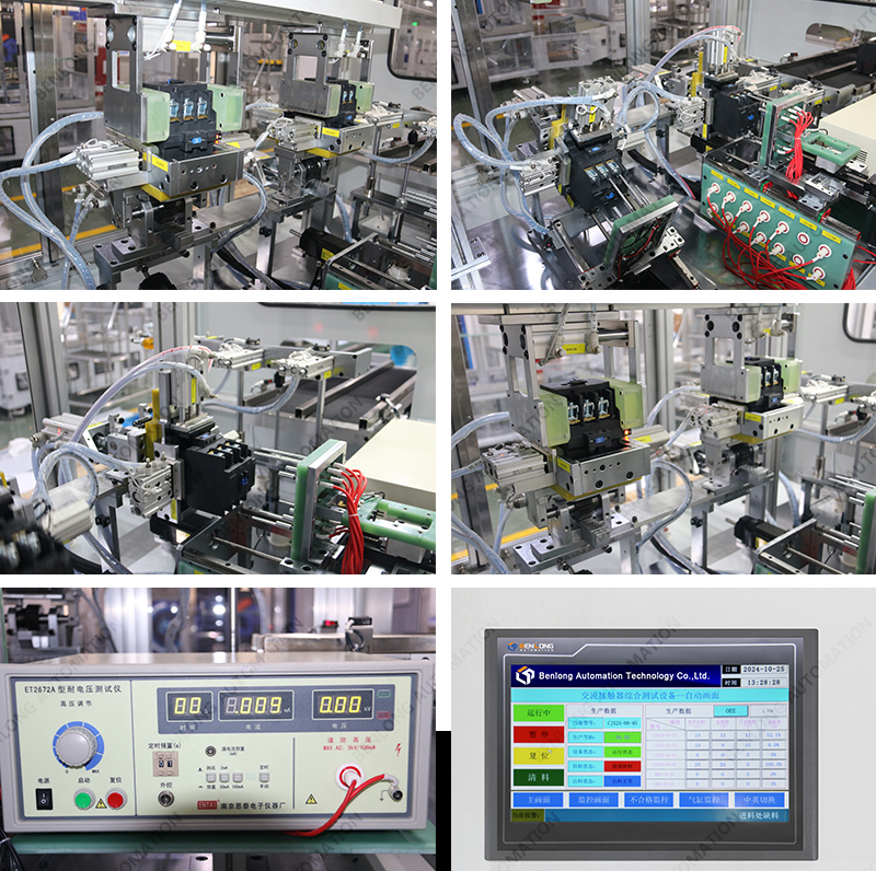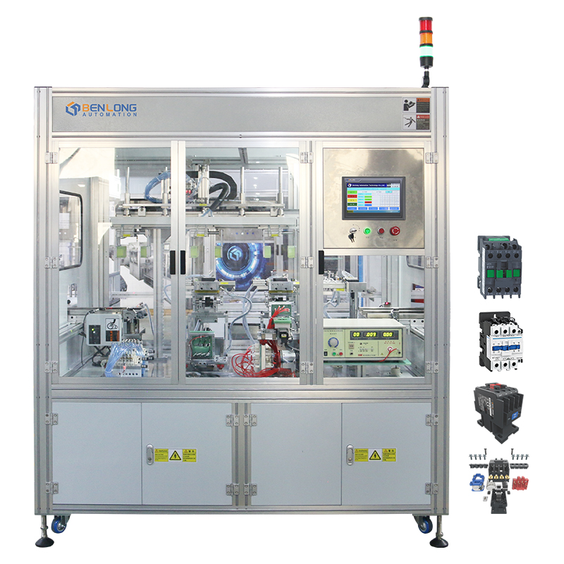 具有自動上料、插芯裝配、底座裝配、主輔靜觸頭裝配、人工裝配寶塔彈簧、鎖上下蓋螺絲、鎖瓦片螺絲、通斷、