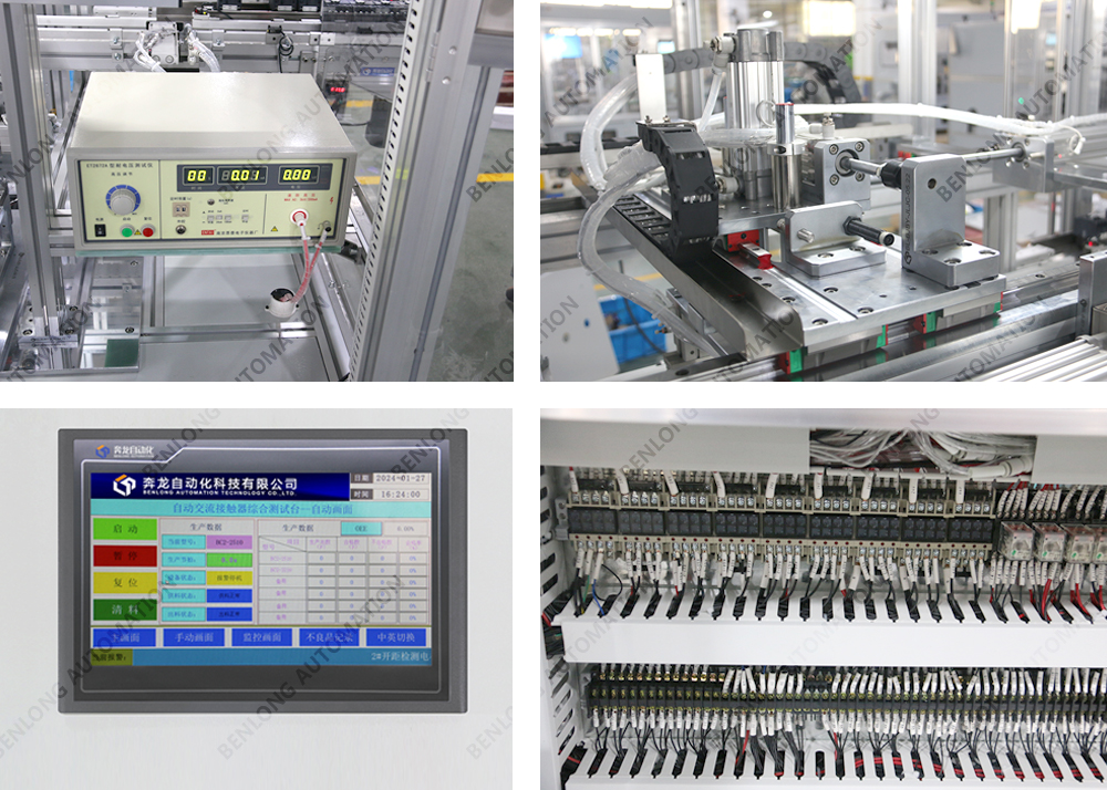 具有自動(dòng)上料、插芯裝配、底座裝配、主輔靜觸頭裝配、人工裝配寶塔彈簧、鎖上下蓋螺絲、鎖瓦片螺絲、通斷、耐壓、功耗、前傾吸合、
