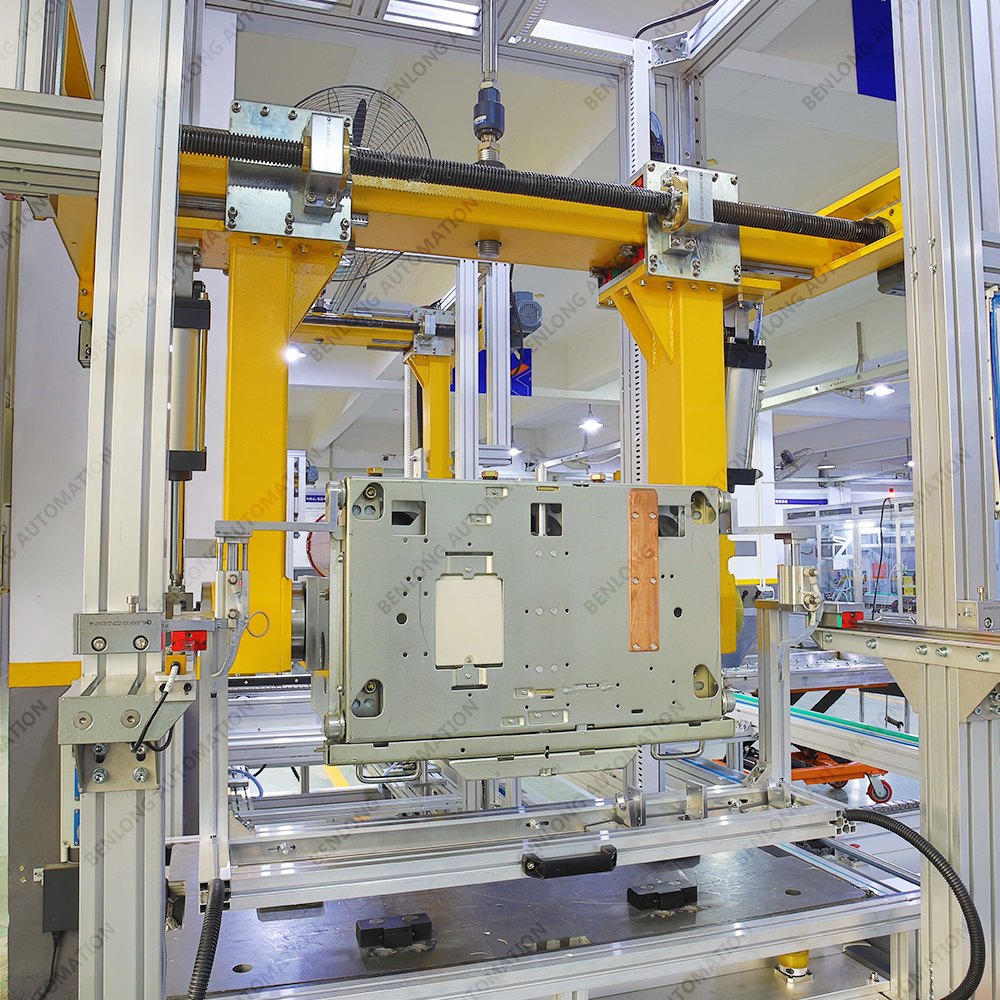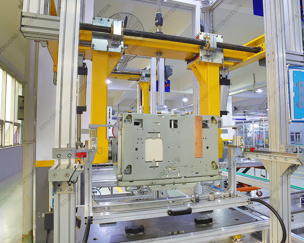 車翻轉(zhuǎn)、底盤車接線、外觀封板裝配、二次綜合檢測(cè)、龍門架自動(dòng)下料、包裝、碼垛、AGV物流輸送、缺料